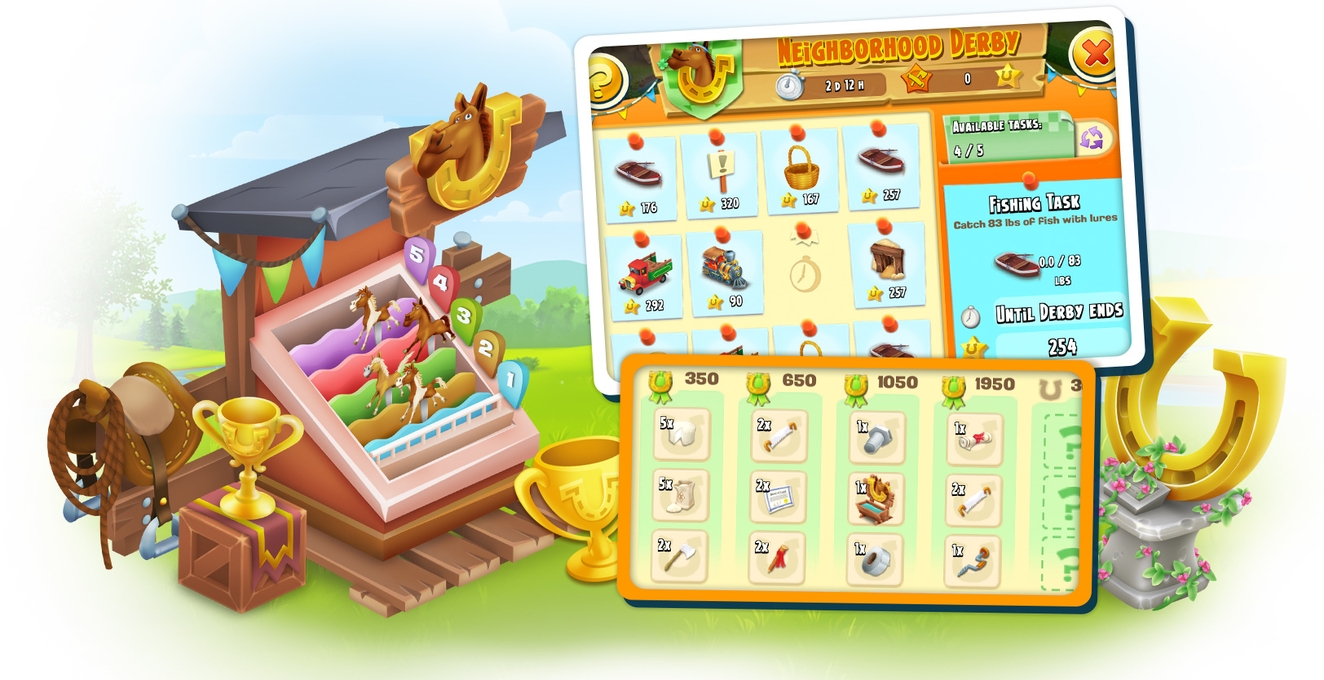A Derby a Hay Day-ben egy heti rendszerességű, keddtől hétfőig tartó esemény, ahol a szomszédságok (Neighborhoods) versenyeznek egymással különböző feladatok teljesítésével. A résztvevők olyan teendők közül választhatnak, mint például a termények betakarítása, állatok etetése vagy teherautós rendelések teljesítése, amikkel pontokat gyűjtenek a csapatuknak. A verseny végén a szerzett pontok és a helyezés alapján értékes jutalmakat lehet nyerni. A sikeres szerepléshez elengedhetetlen a szomszédok közötti jó kommunikáció és a magas pontszámú feladatok tudatos kiválasztása.