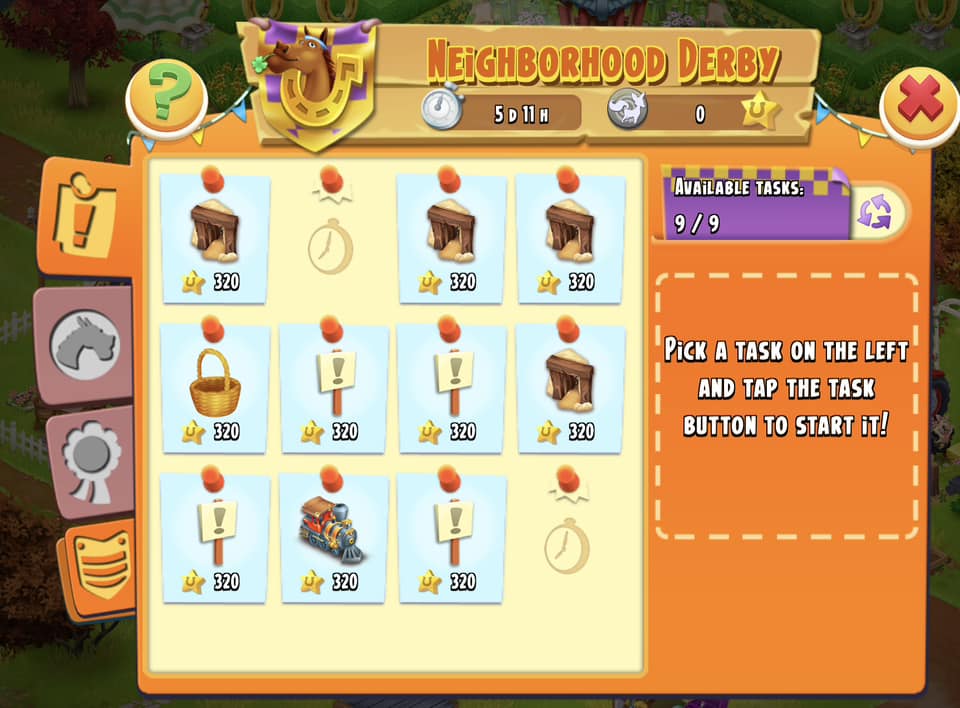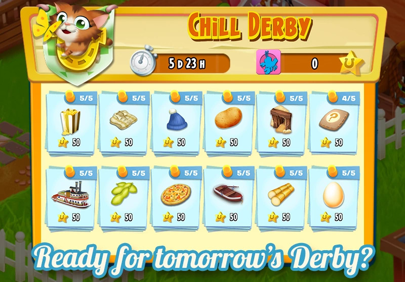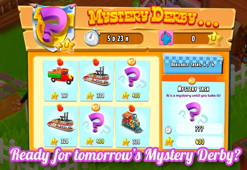 - Mystery (Rejtélyes) Derby: A feladatok lila kérdőjellel vannak jelölve. Csak akkor tudod meg, mit kell csinálnod (pl. horgászni vagy sütni), miután elvállaltad. Cserébe 400 pontot érnek!