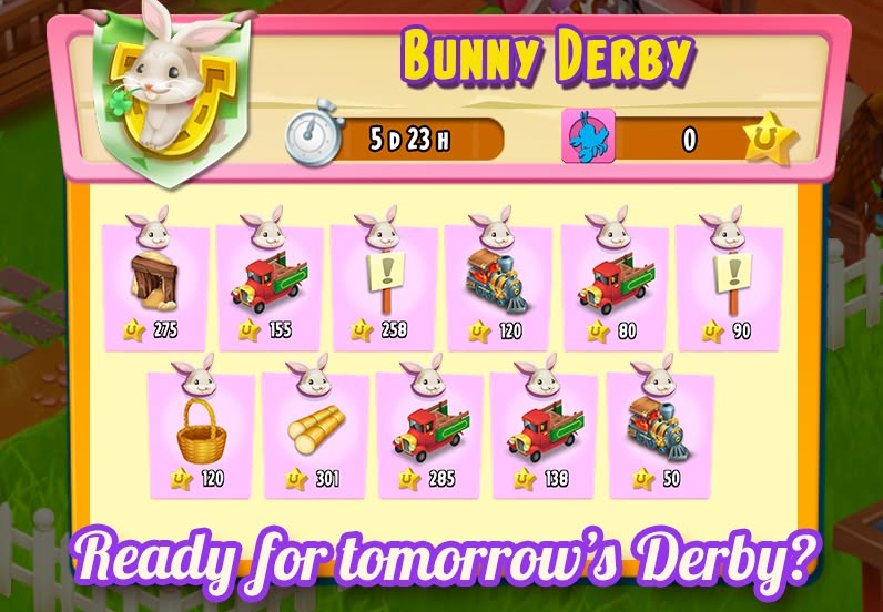 A normál Derby a játék legegyszerűbb versenyformája, ahol nincsenek extra csavarok, mint például bingótáblák vagy nyuszik elkapása. A cél csupán annyi, hogy a szomszédság tagjai a feladattábláról kiválasszák és teljesítsék a számukra legkedvezőbb küldetéseket a lehető legmagasabb pontszámért. Minél több pontot gyűjt össze a csapat közösen, annál több "patkót" szerezhettek, amelyek a verseny végén különböző jutalmakat érnek. A sikeres taktika általában az, hogy a játékosok csak a 320 pontos feladatokat vállalják el, a kisebb pontszámúakat pedig törlik a tábláról.