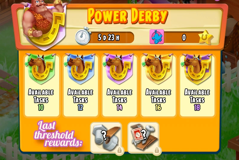 A Power Derby a gyorsaságról és a nagy volumenű feladatteljesítésről szól, ahol a megszokottnál kétszer több küldetést hajthatnak végre a játékosok (pl. Bajnokok Ligájában 9 helyett akár 18-at). Ebben a típusban a feladatok pontszáma egységesen 320 pont, viszont a teljesítésükhöz szükséges feltételek (például a begyűjtendő termények mennyisége) jelentősen le vannak egyszerűsítve. Mivel a feladatok gyorsabban és könnyebben elvégezhetők, a verseny rendkívül pörgős, és a győzelemhez szinte elengedhetetlen az összes elérhető feladatpont maximalizálása. Ez a derby típus kiváló lehetőség arra, hogy a szomszédság gyorsan sok "patkót" és jutalmat gyűjtsön össze.
