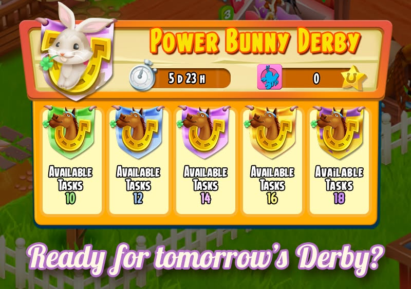A Power Bunny Derby két különleges derby típus, a Power (Erő) és a Bunny (Nyuszi) szabályait ötvözi, így a szokásosnál jóval több feladatot végezhettek el gyorsított tempóban. A Power jelleg miatt a feladatok könnyebbek és egységesen 320 pontot érnek, a Bunny (nyuszi) elem pedig extra jutalmakat kínál a verseny során. A cél az, hogy a "Nyuszi időszakok" alatt teljesítsétek a feladatokat, mert így kaphattok esélyt a három plusz nyuszi-jutalom oszlop megszerzésére. Ez a legpörgősebb derby típus, ahol a gyors munkáért cserébe nemcsak a ligában léphettek előre, hanem extra bónusz tárgyakat is nyerhettek.