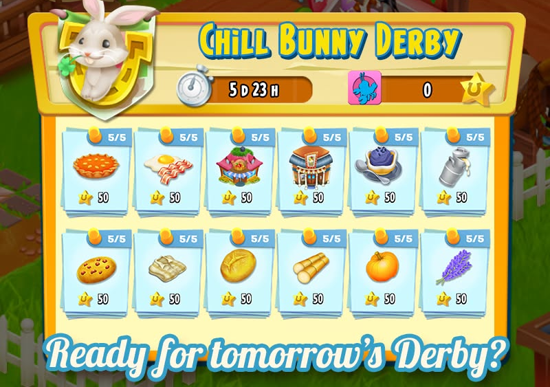 A Chill Bunny Derby a pihentető és a nyuszis derby elemeit ötvözi, ahol versenyzés helyett a közös jutalomszerzésen van a hangsúly. A játékosok naponta 5 egyszerű, 50 pontos feladatot kapnak, amelyeket a "Nyuszi időszakok" alatt teljesítve extra jutalomkártyákat oldhatnak fel. Mivel ebben a típusban sincs kiesés vagy ranglista, a szomszédság stresszmentesen, a saját tempójában vadászhat a három megszerezhető nyuszira. Ez a kombináció a legnyugodtabb módja annak, hogy a napi rutin mellett extra bónusz tárgyakat és fejlesztőket gyűjtsetek be.