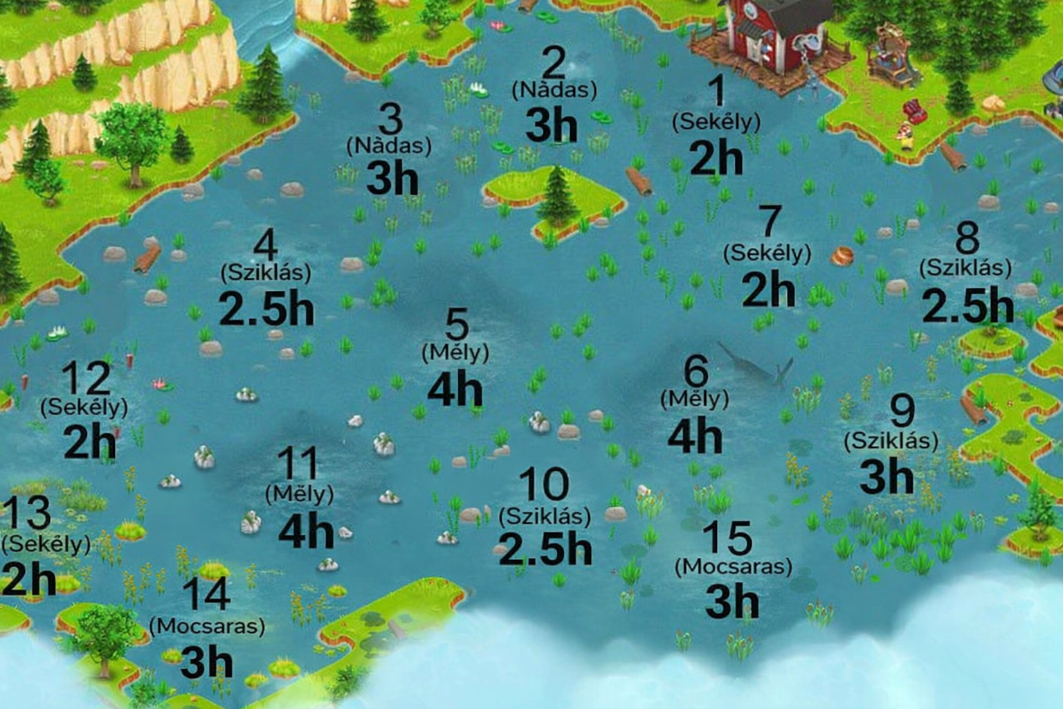 Speciális helyek: Van olyan hal, ami csak a nádasban (pl. 3-as hely), és van, ami csak a mély vízben (pl. 11-es hely) bukkan fel.
