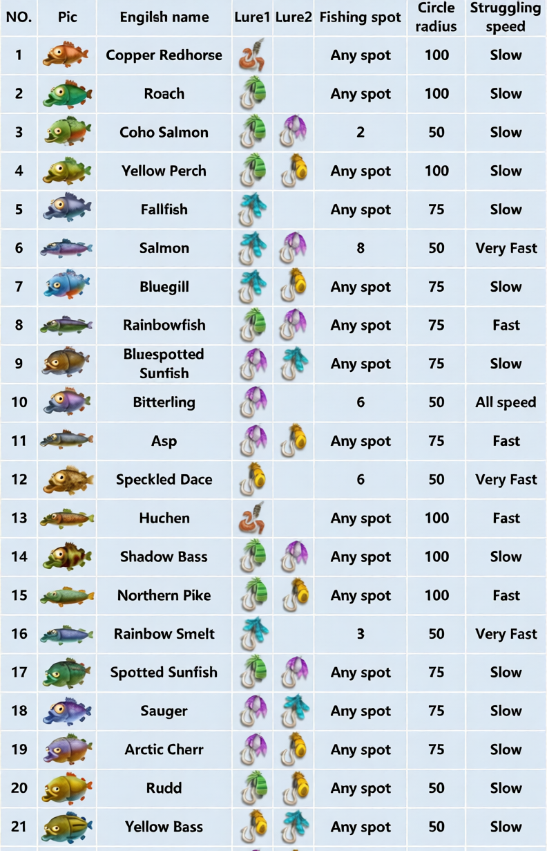 A horgásztó 15 különböző helyre oszlik. Bár nincsenek beszámozva a játékban, a közösség általánosan elfogadott térképe alapján: