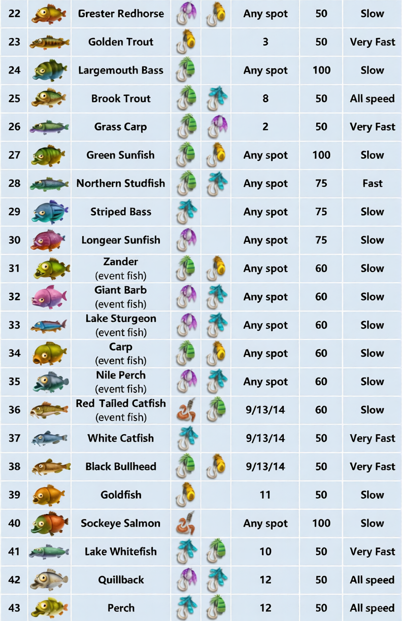 Van hat speciális fajta, amelyek kizárólag a horgász események (Fishing Events) alatt foghatók ki. Ezeket a horgászkönyvben egy mérleg szimbólum jelöli. Ha nincs esemény, hiába horgászol színes csalival, nem fogod látni őket.