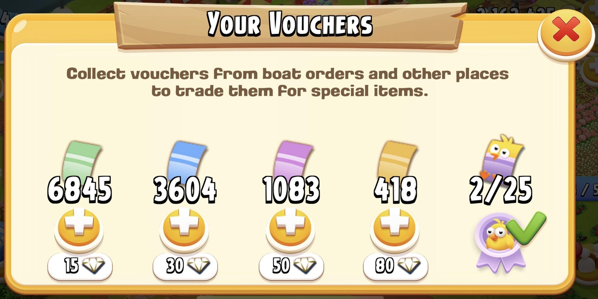 A Voucherek (utalványok) színes papírfecnik a Hay Day-ben, amelyeket főként háziállatok (példák: kutyák, macskák, lovak) és különleges dekorációk vásárlására, valamint horgászcsalik készítésére használhatsz. Ötféle ritkaságban léteznek (zöld, kék, lila és arany, csibe), és leggyakrabban hajós szállítmányok teljesítésével, speciális teherautós rendelésekkel vagy szerencsekerékkel szerezheted meg őket. Mivel nem foglalnak helyet a raktárban, korlátlan mennyiséget gyűjthetsz belőlük a távolabbi céljaid eléréséhez.